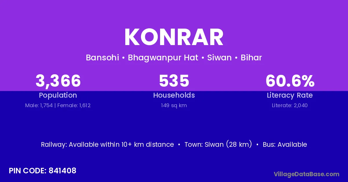 Siwan (28 km) is the nearest town to Konrar village for major economic activities and is located approximately 28 km away.