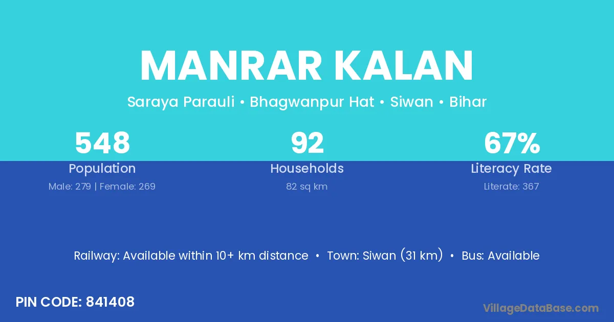Siwan (31 km) is the nearest town to Manrar Kalan village for major economic activities and is located approximately 31 km away.