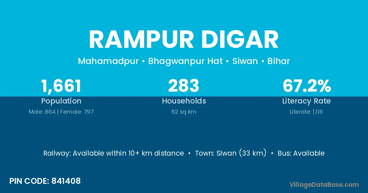 Siwan (33 km) is the nearest town to Rampur Digar village for major economic activities and is located approximately 33 km away.