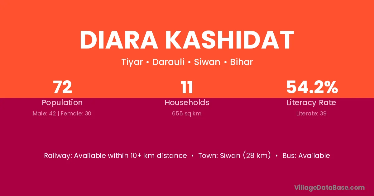 Siwan (28 km) is the nearest town to Diara Kashidat village for major economic activities and is located approximately 28 km away.