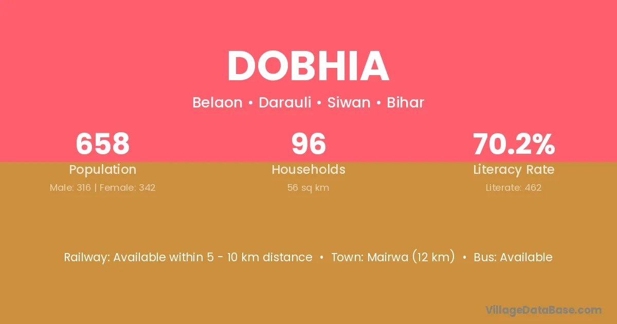 Mairwa (12 km) is the nearest town to Dobhia village for major economic activities and is located approximately 12 km away.