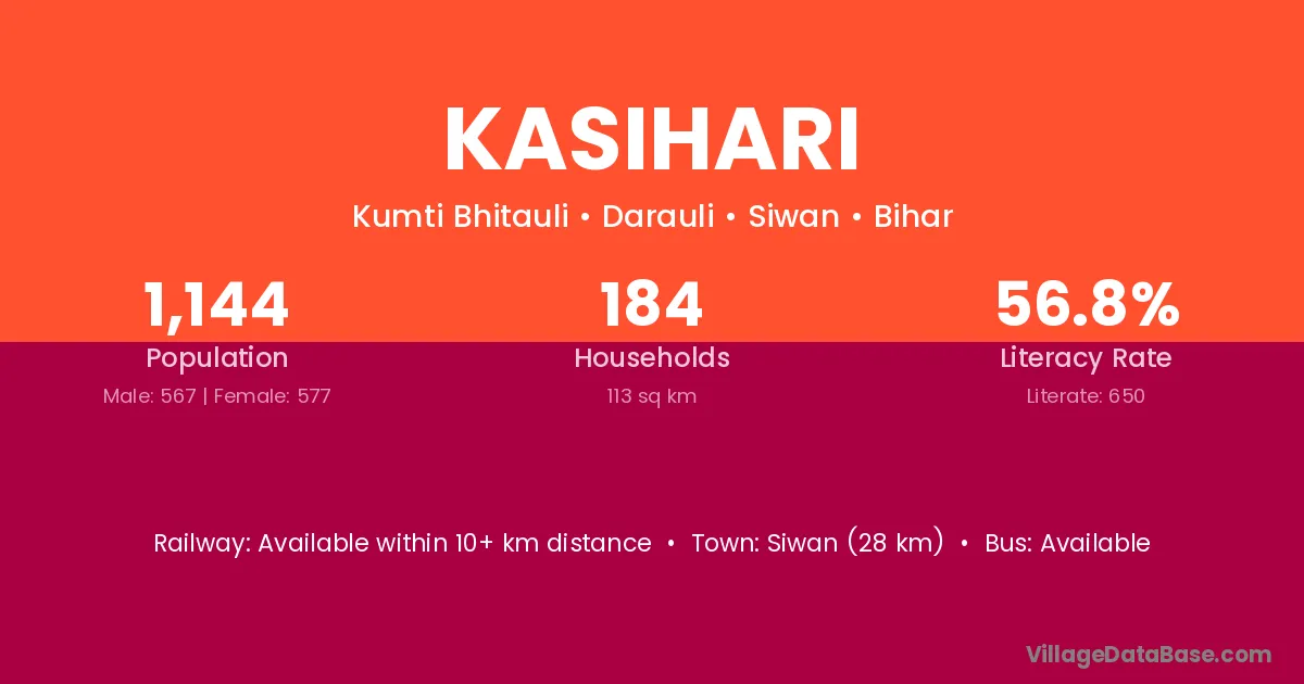 Kasihari village has a total population of 1,144 people, of which 567 are males and 577 are females.