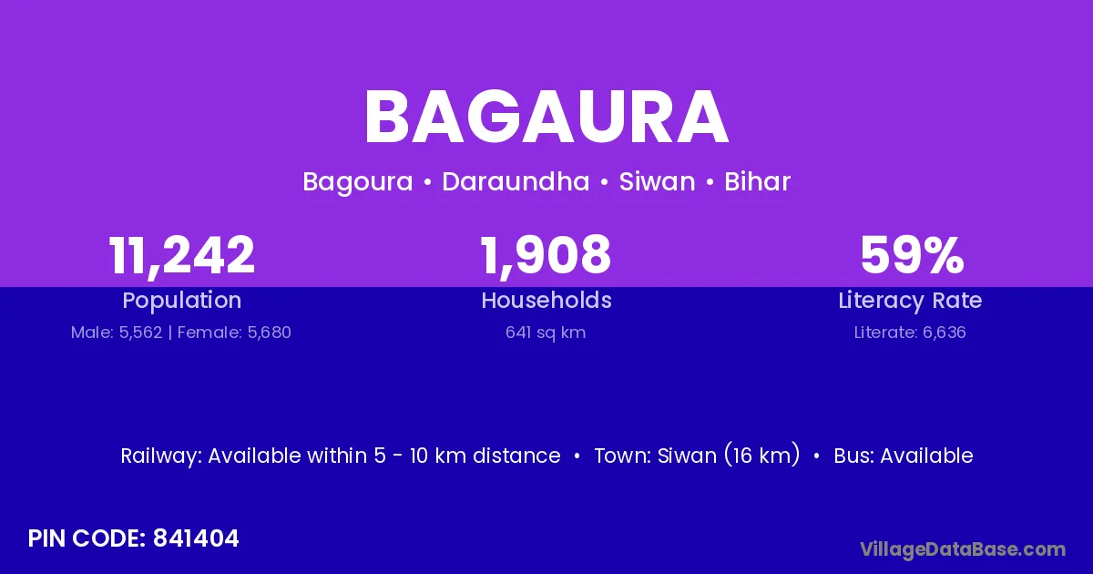 Siwan (16 km) is the nearest town to Bagaura village for major economic activities and is located approximately 16 km away.