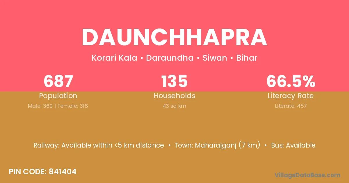 Daunchhapra village has a total population of 687 people, of which 369 are males and 318 are females.