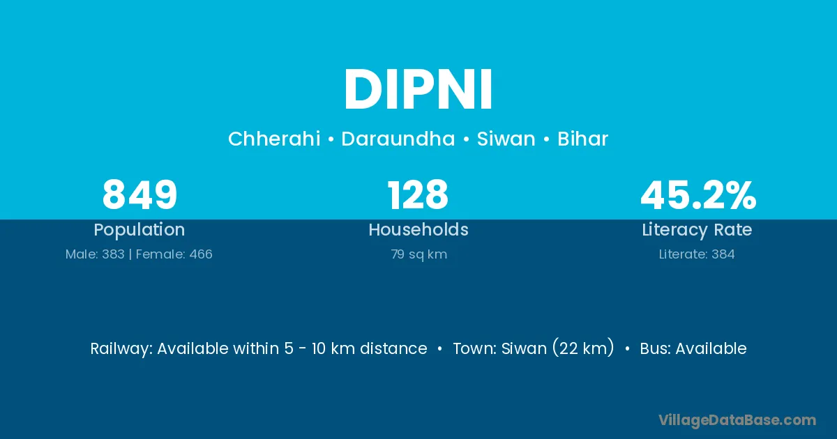 Siwan (22 km) is the nearest town to Dipni village for major economic activities and is located approximately 22 km away.