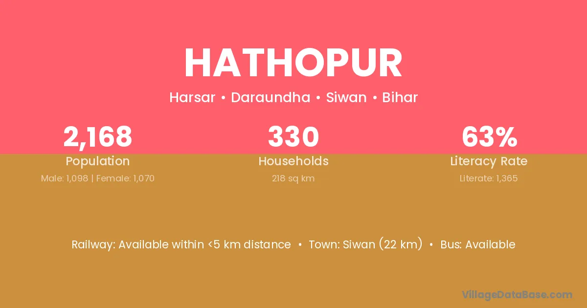 Siwan (22 km) is the nearest town to Hathopur village for major economic activities and is located approximately 22 km away.