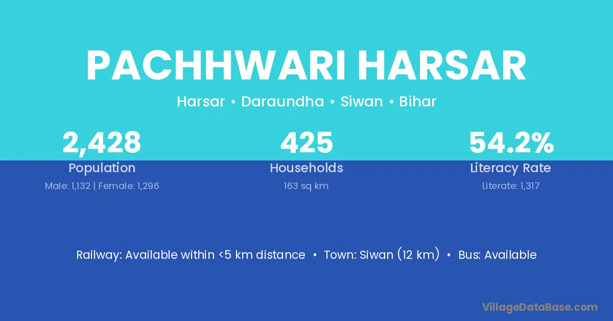 Siwan (12 km) is the nearest town to Pachhwari Harsar village for major economic activities and is located approximately 12 km away.