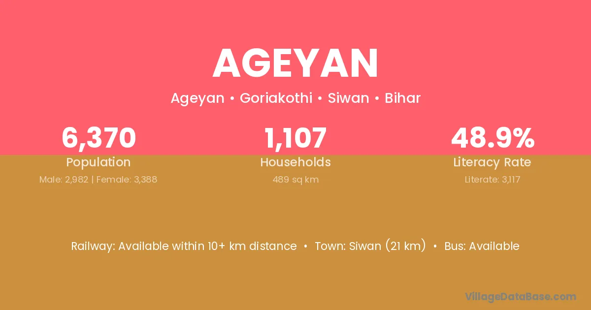 Siwan (21 km) is the nearest town to Ageyan village for major economic activities and is located approximately 21 km away.