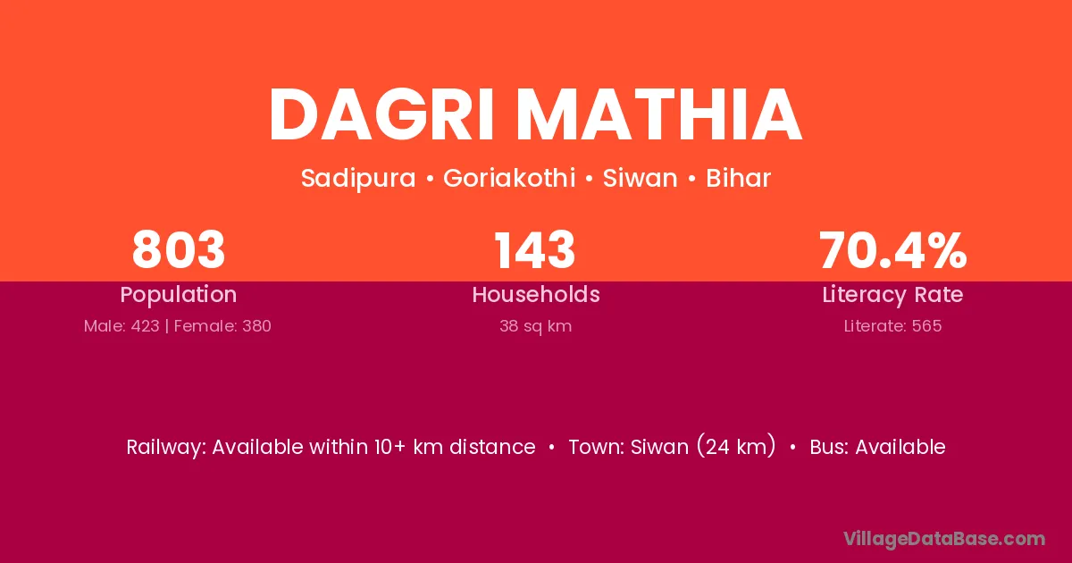 Siwan (24 km) is the nearest town to Dagri Mathia village for major economic activities and is located approximately 24 km away.