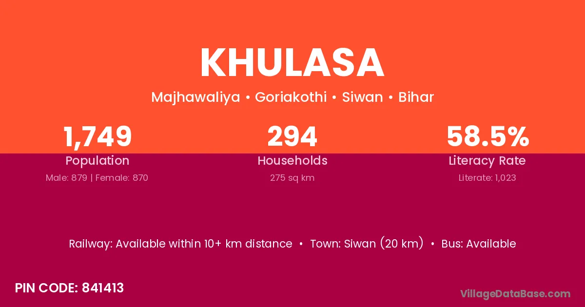 Siwan (20 km) is the nearest town to Khulasa village for major economic activities and is located approximately 20 km away.