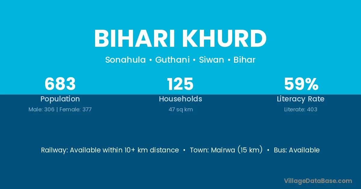 Bihari Khurd village has a total population of 683 people, of which 306 are males and 377 are females.