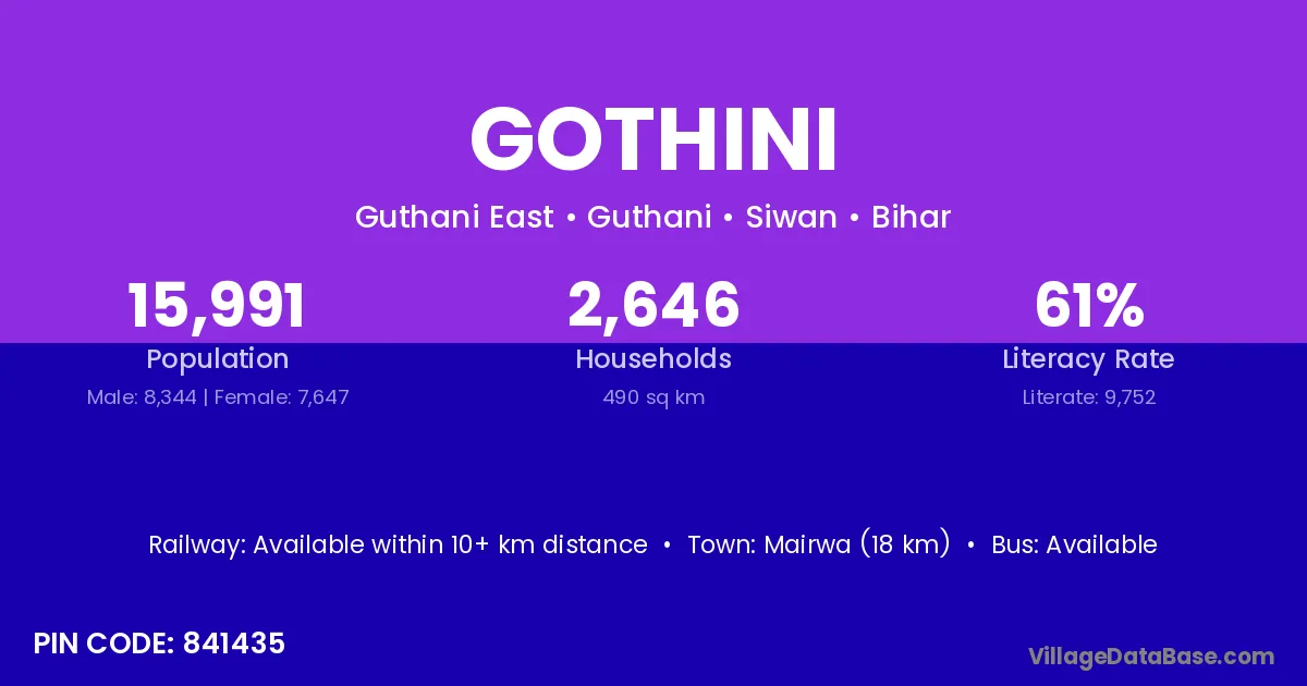 Mairwa (18 km) is the nearest town to Gothini village for major economic activities and is located approximately 18 km away.