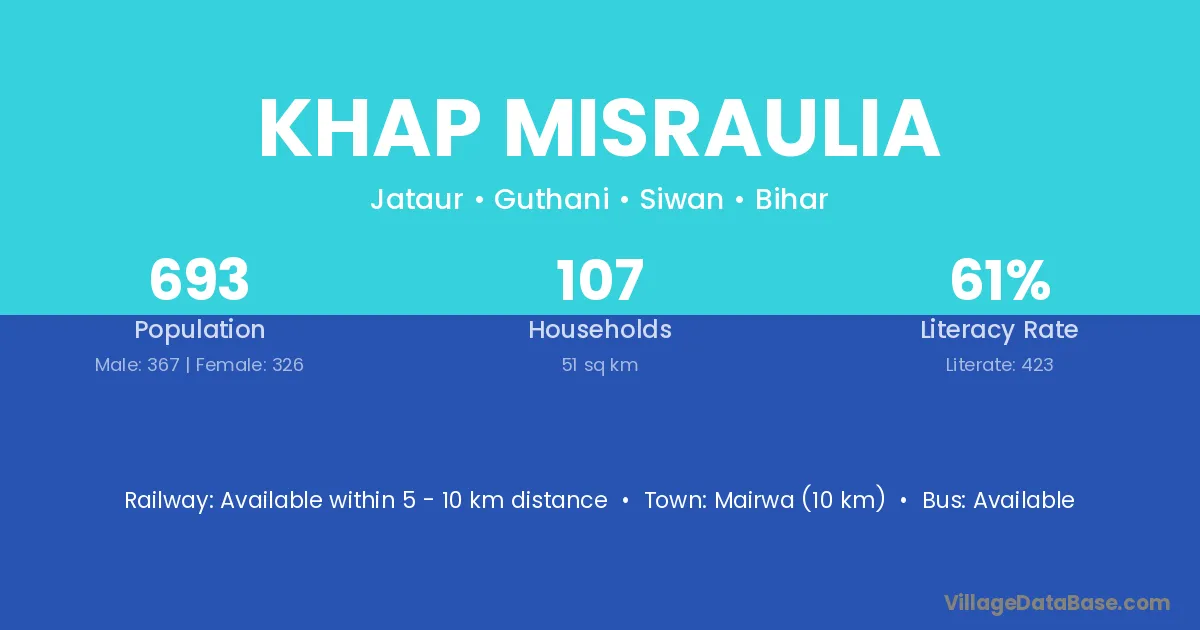 Mairwa (10 km) is the nearest town to Khap Misraulia village for major economic activities and is located approximately 10 km away.
