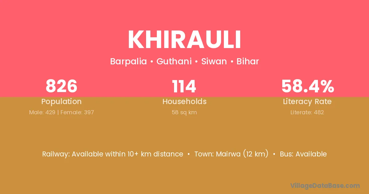 Mairwa (12 km) is the nearest town to Khirauli village for major economic activities and is located approximately 12 km away.