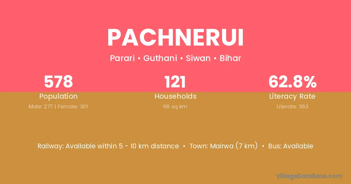 Mairwa (7 km) is the nearest town to Pachnerui village for major economic activities and is located approximately 7 km away.