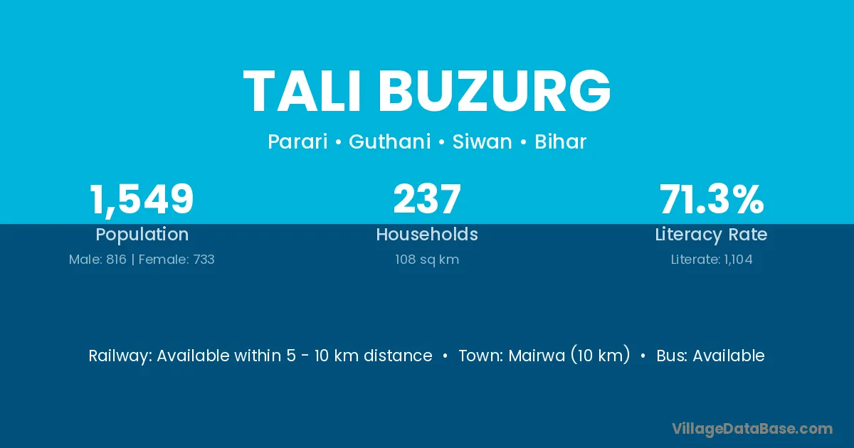 Mairwa (10 km) is the nearest town to Tali Buzurg village for major economic activities and is located approximately 10 km away.