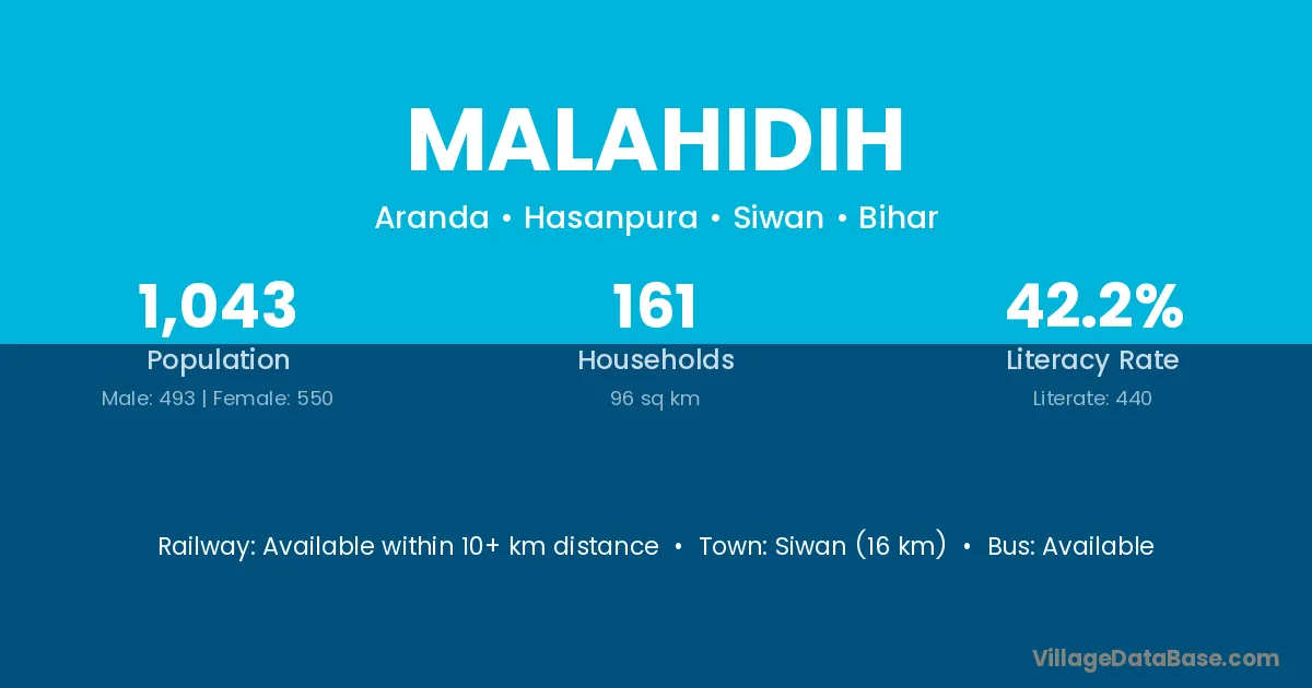 Siwan (16 km) is the nearest town to Malahidih village for major economic activities and is located approximately 16 km away.