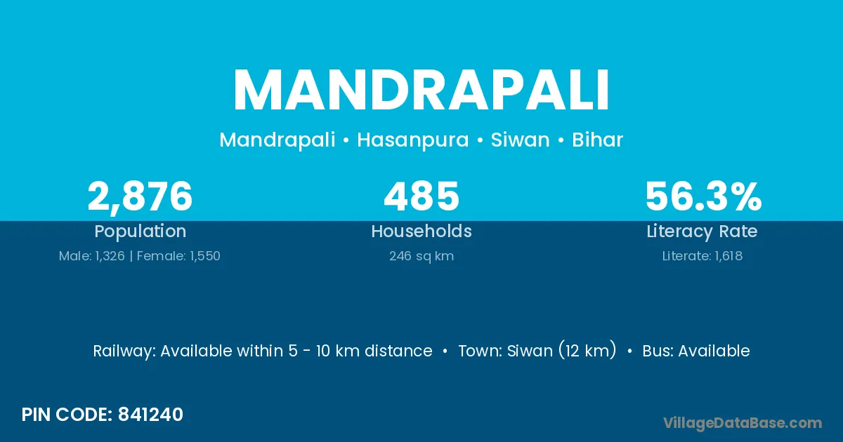 Siwan (12 km) is the nearest town to Mandrapali village for major economic activities and is located approximately 12 km away.