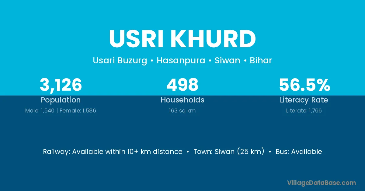 Siwan (25 km) is the nearest town to Usri Khurd village for major economic activities and is located approximately 25 km away.