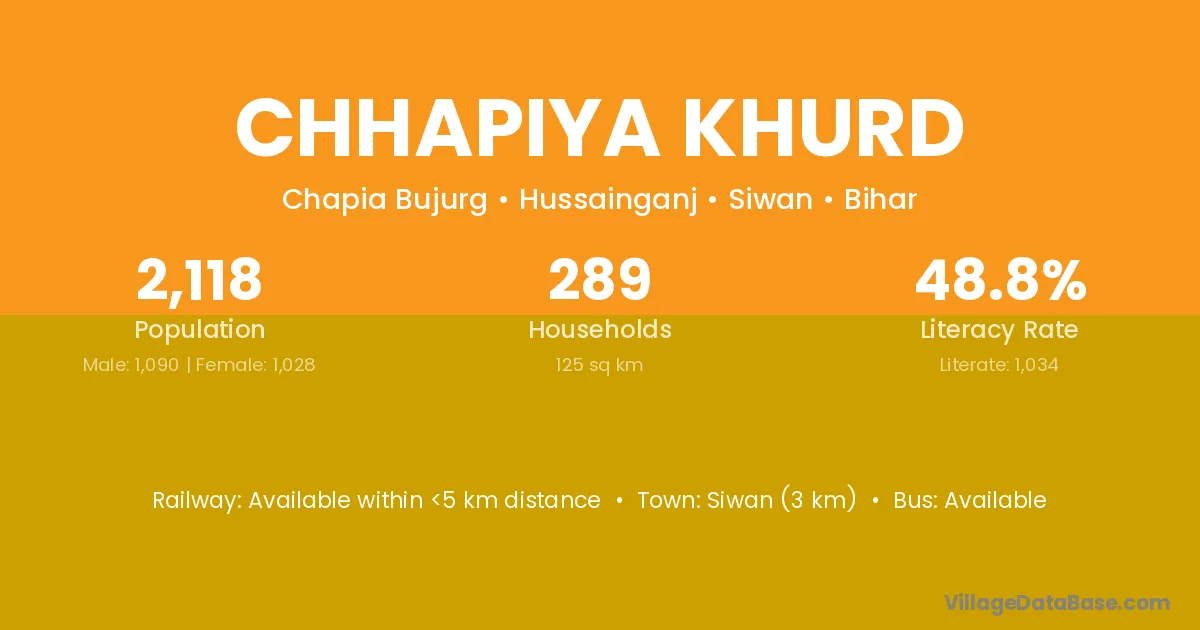 Chhapiya Khurd village has a total population of 2,118 people, of which 1,090 are males and 1,028 are females.