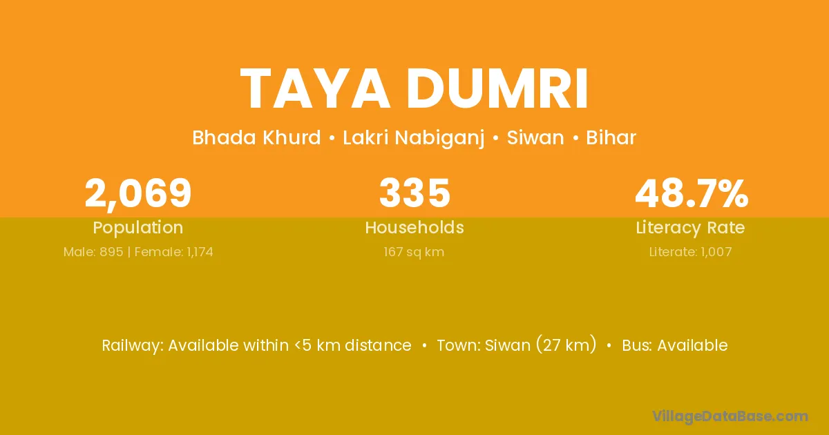Siwan (27 km) is the nearest town to Taya Dumri village for major economic activities and is located approximately 27 km away.