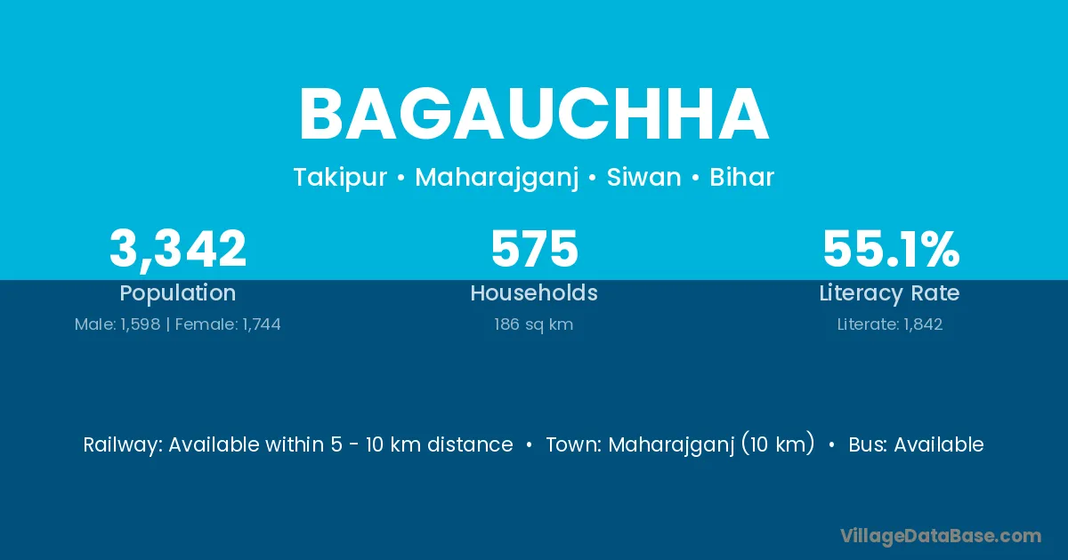 Maharajganj (10 km) is the nearest town to Bagauchha village for major economic activities and is located approximately 10 km away.