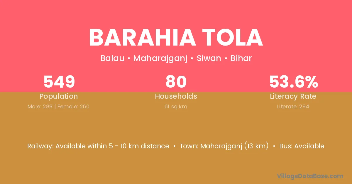 Maharajganj (13 km) is the nearest town to Barahia Tola village for major economic activities and is located approximately 13 km away.