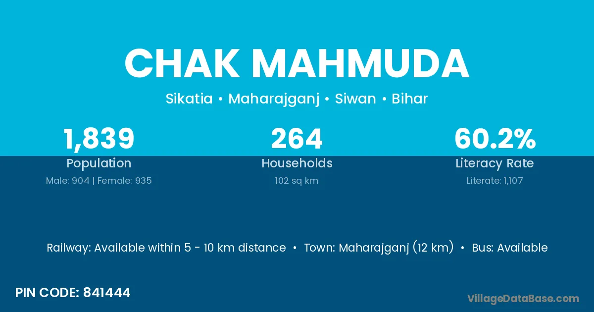 Maharajganj (12 km) is the nearest town to Chak Mahmuda village for major economic activities and is located approximately 12 km away.