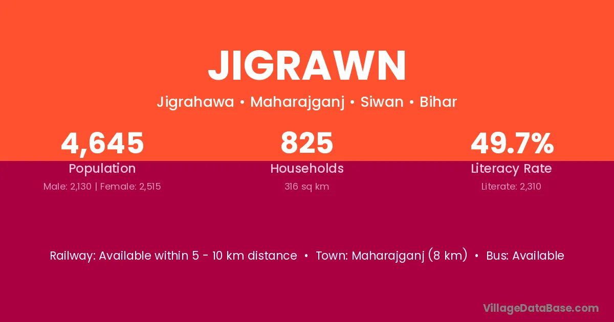 Maharajganj (8 km) is the nearest town to Jigrawn village for major economic activities and is located approximately 8 km away.