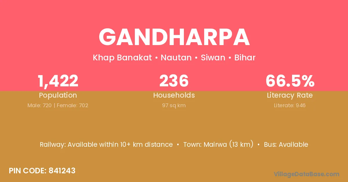 Mairwa (13 km) is the nearest town to Gandharpa village for major economic activities and is located approximately 13 km away.