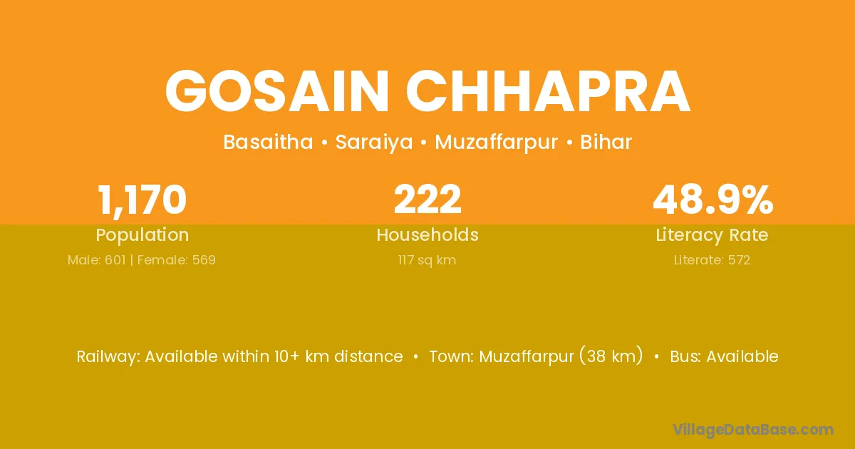 Siwan (2 km) is the nearest town to Gosain Chhapra village for major economic activities and is located approximately 2 km away.