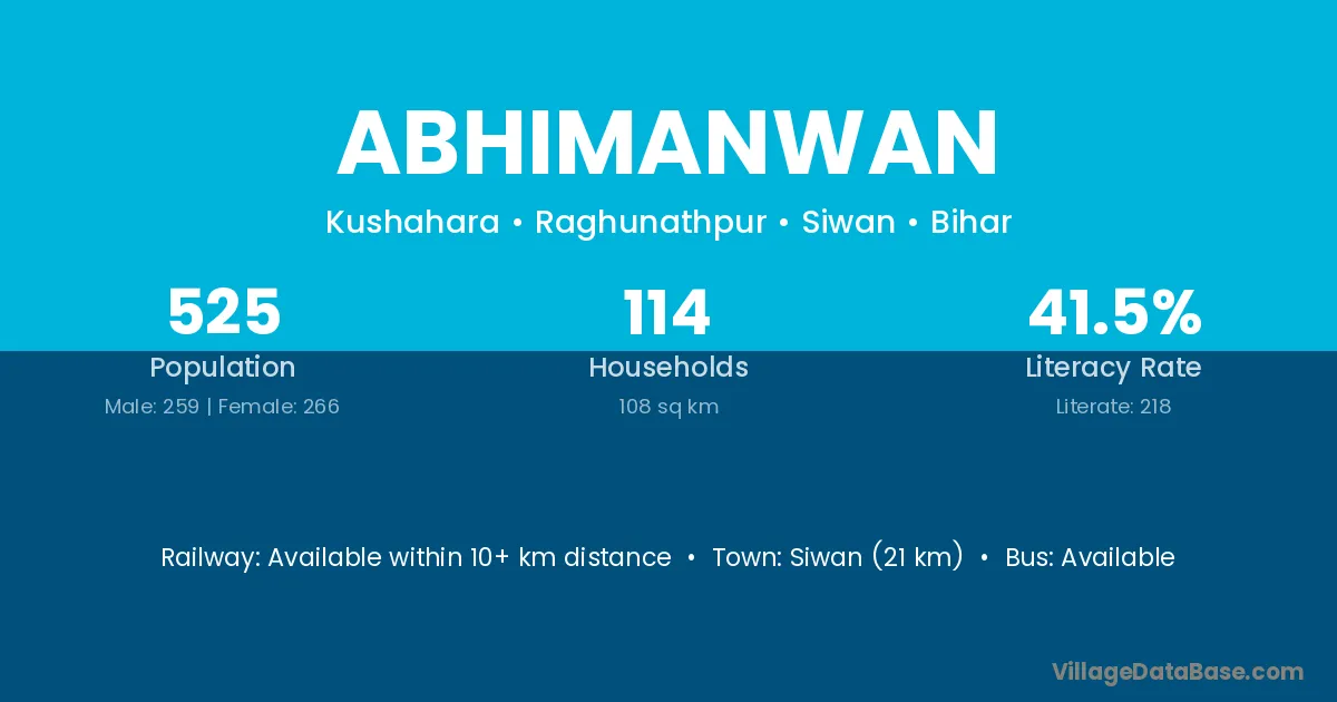 Siwan (21 km) is the nearest town to Abhimanwan village for major economic activities and is located approximately 21 km away.