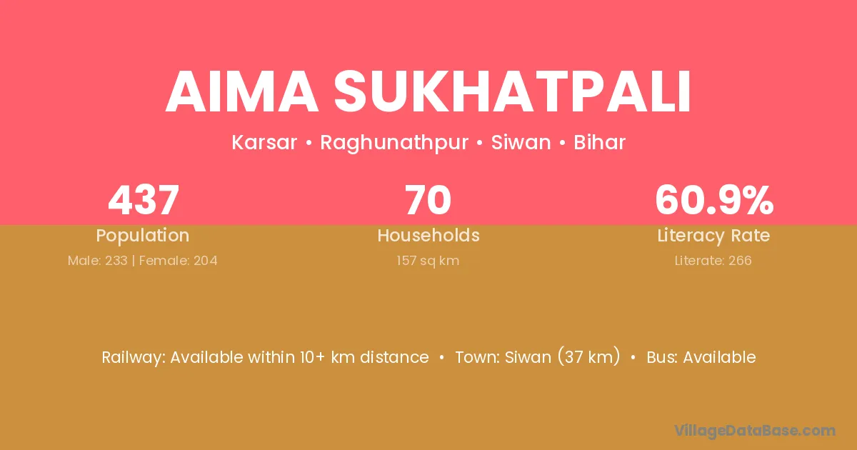 Siwan (37 km) is the nearest town to Aima Sukhatpali village for major economic activities and is located approximately 37 km away.