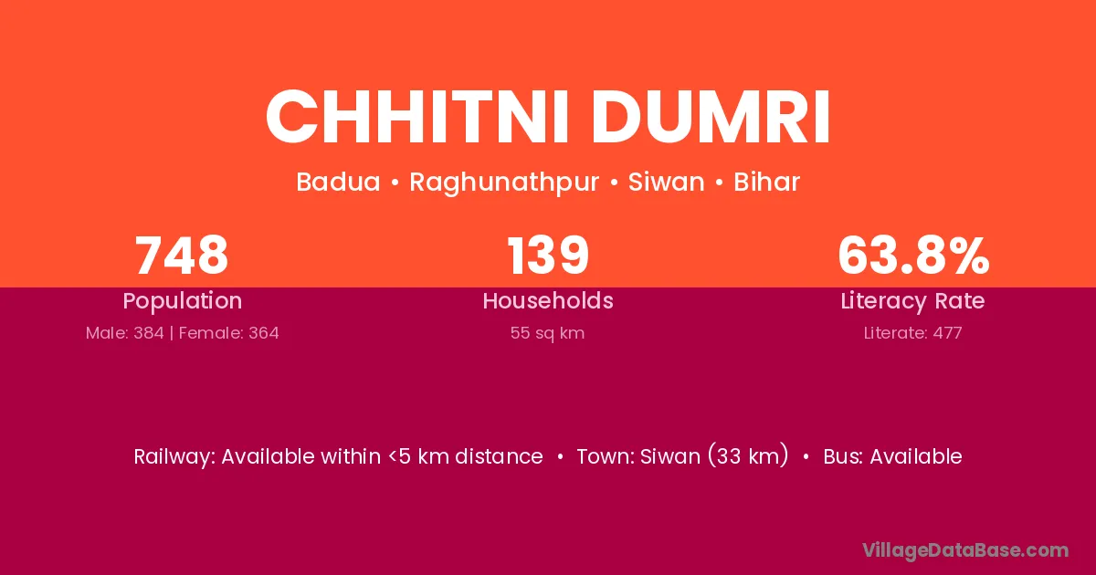 Siwan (33 km) is the nearest town to Chhitni Dumri village for major economic activities and is located approximately 33 km away.