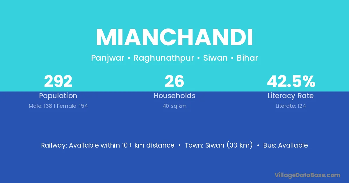 Siwan (33 km) is the nearest town to Mianchandi village for major economic activities and is located approximately 33 km away.