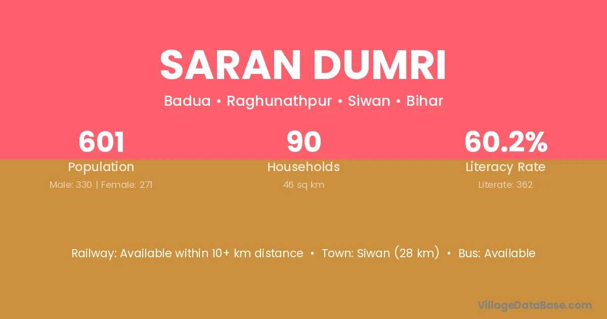 Siwan (28 km) is the nearest town to Saran Dumri village for major economic activities and is located approximately 28 km away.