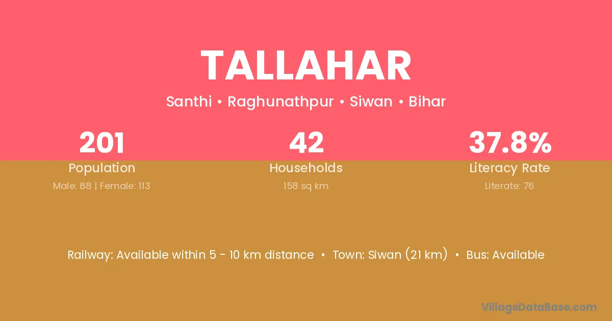 Siwan (21 km) is the nearest town to Tallahar village for major economic activities and is located approximately 21 km away.