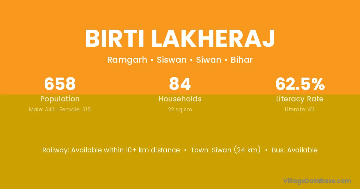 Siwan (24 km) is the nearest town to Birti Lakheraj village for major economic activities and is located approximately 24 km away.