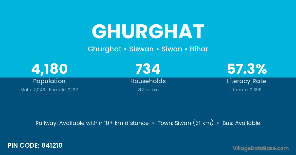 Siwan (31 km) is the nearest town to Ghurghat village for major economic activities and is located approximately 31 km away.