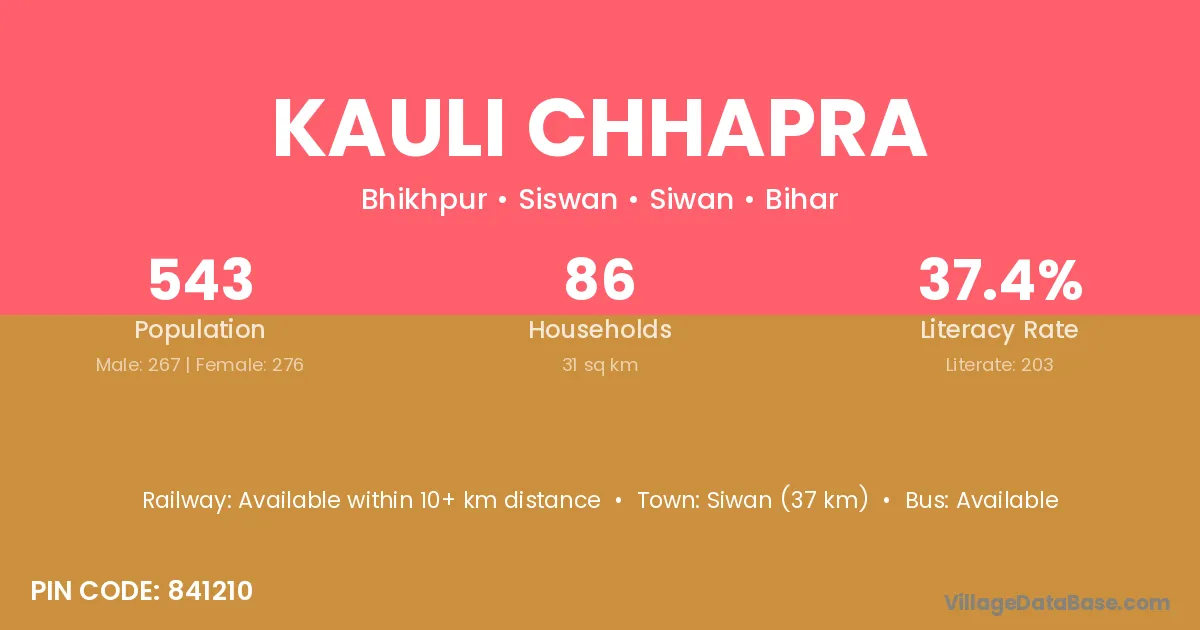 Kauli Chhapra village has a total population of 543 people, of which 267 are males and 276 are females.