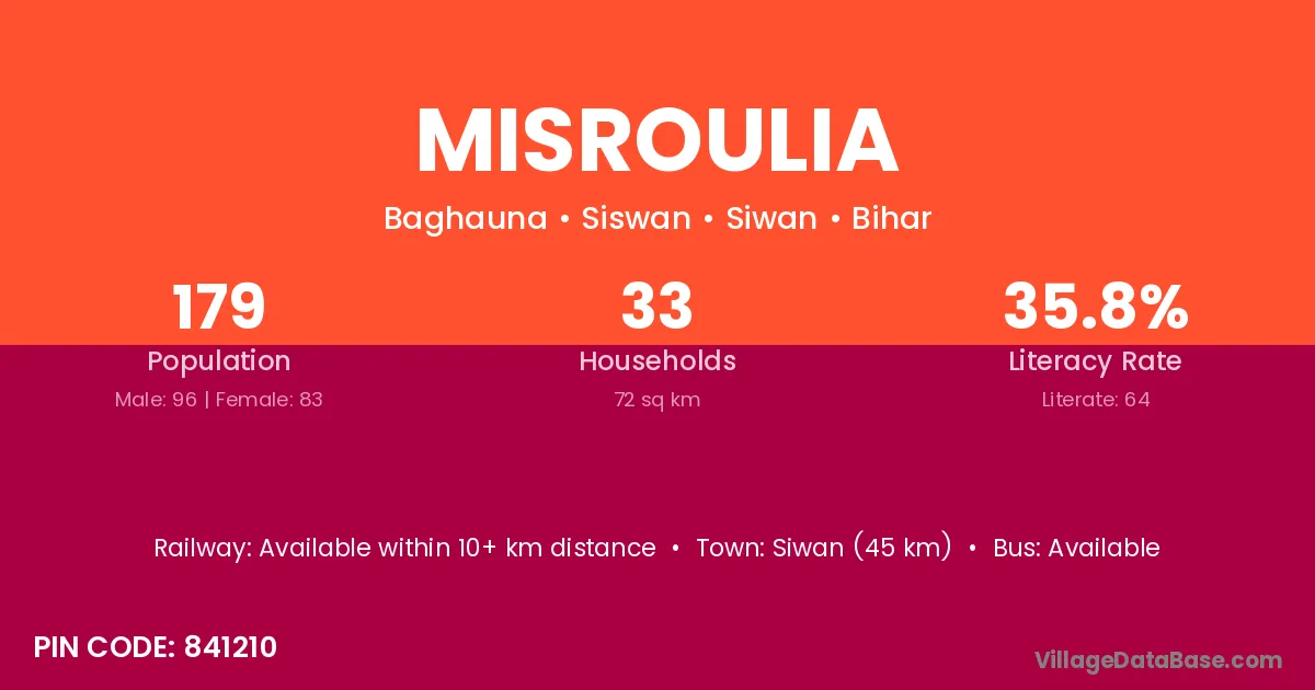 Siwan (45 km) is the nearest town to Misroulia village for major economic activities and is located approximately 45 km away.