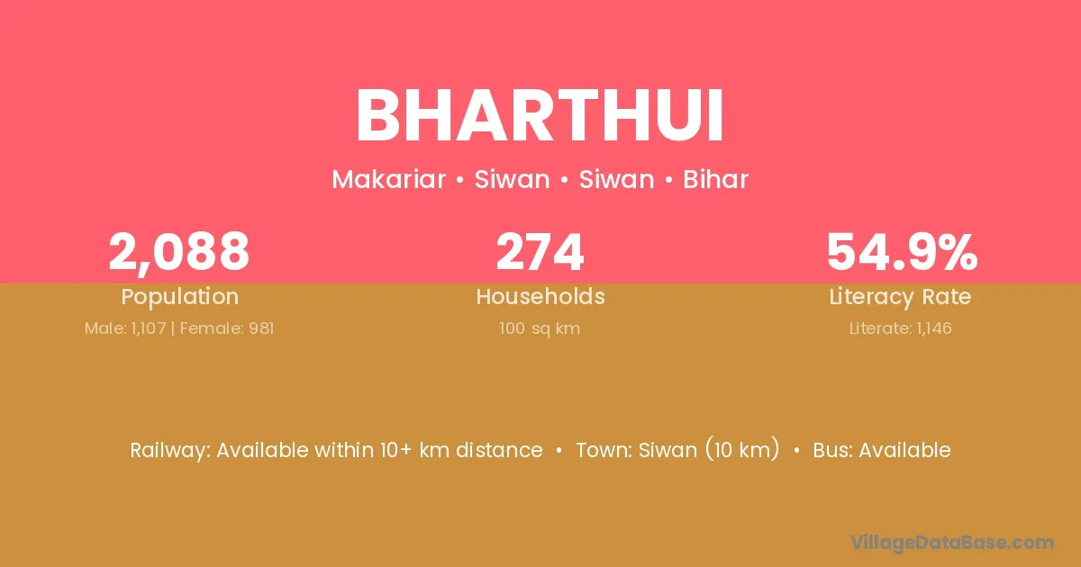 Siwan (16 km) is the nearest town to Bharthui village for major economic activities and is located approximately 16 km away.