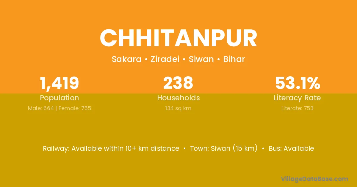 Siwan (15 km) is the nearest town to Chhitanpur village for major economic activities and is located approximately 15 km away.