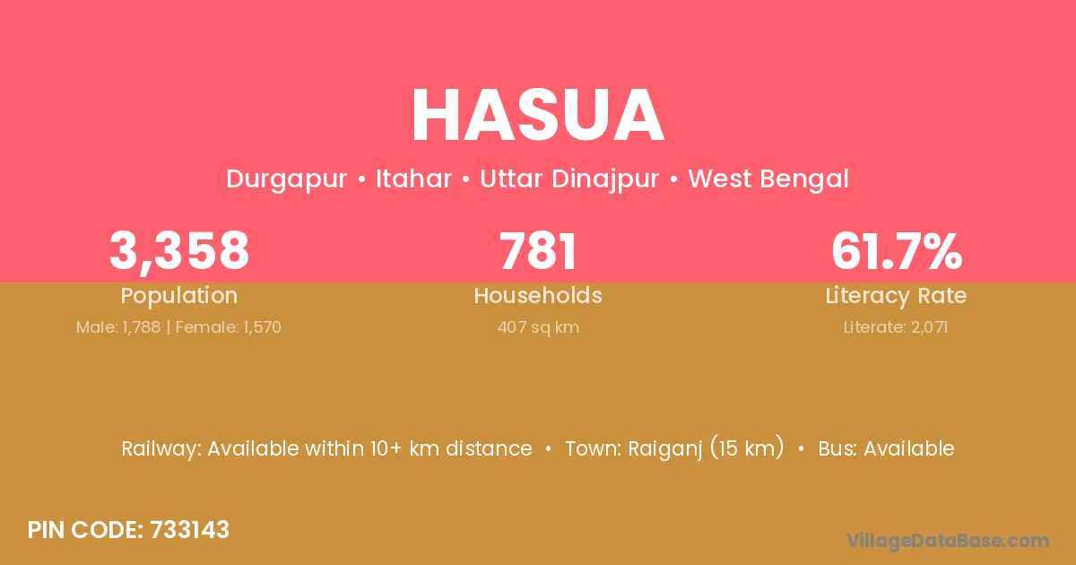 Hasua village has a total population of 7,036 people, of which 3,505 are males and 3,531 are females.