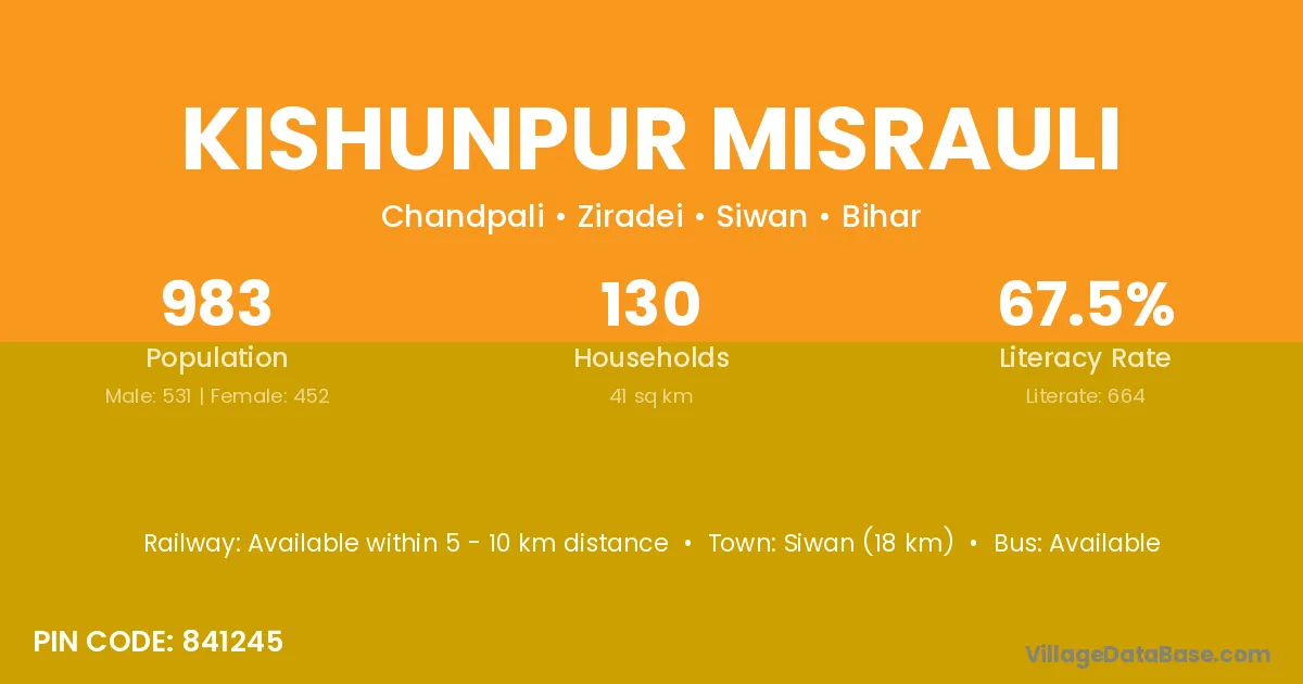 Siwan (18 km) is the nearest town to Kishunpur Misrauli village for major economic activities and is located approximately 18 km away.