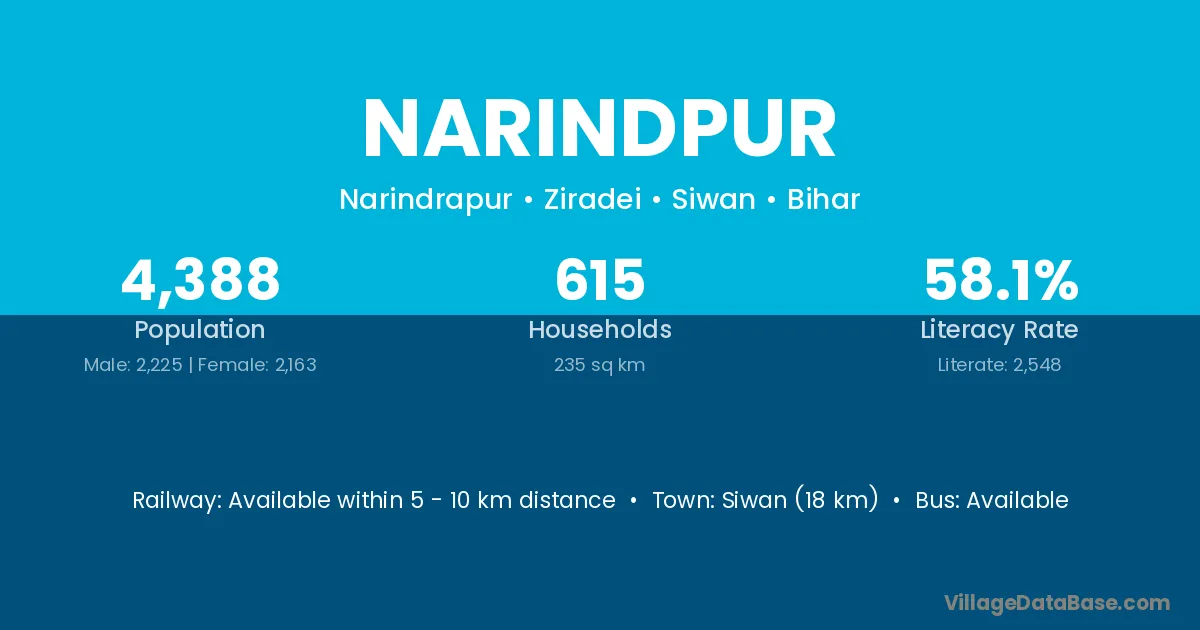 Siwan (18 km) is the nearest town to Narindpur village for major economic activities and is located approximately 18 km away.