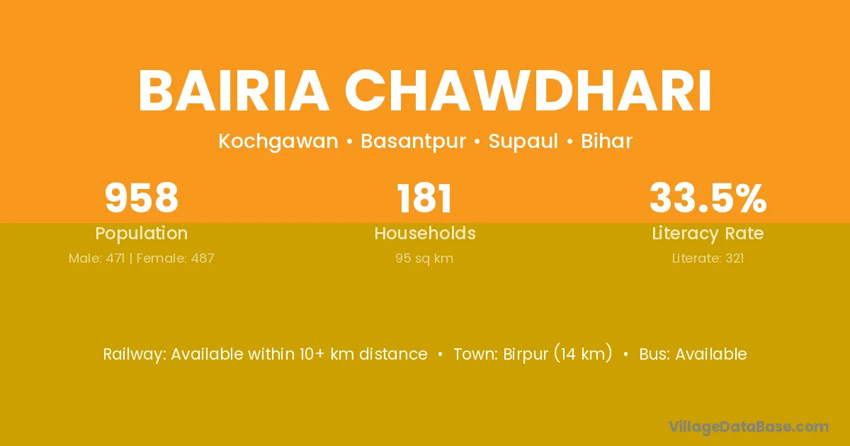Birpur (14 km) is the nearest town to Bairia Chawdhari village for major economic activities and is located approximately 14 km away.