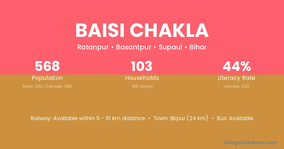 Birpur (24 km) is the nearest town to Baisi Chakla village for major economic activities and is located approximately 24 km away.