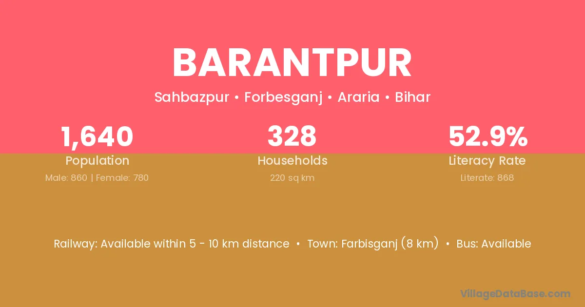 Birpur (5 km) is the nearest town to Barantpur village for major economic activities and is located approximately 5 km away.