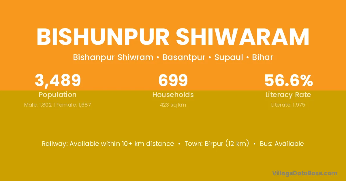 Birpur (12 km) is the nearest town to Bishunpur Shiwaram village for major economic activities and is located approximately 12 km away.